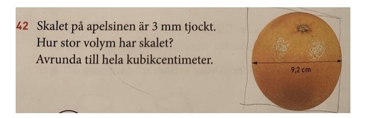 för att nu ta reda på skalets volym ska du ta hela apelsinens volym - innehållets volym. Kvar blir skalets volym, eller hur?