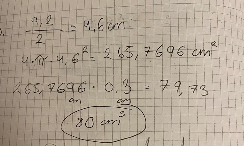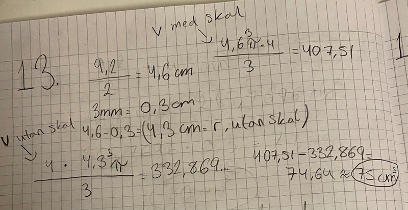 sedan måste du räkna ut volymen på själva innehållet. Eftersom skalet är 3mm tjockt kommer du behöva ändra måtten för radien. Den blir ju ___cm tunnare. Använd sedan samma formel för att räkna ut volymen.