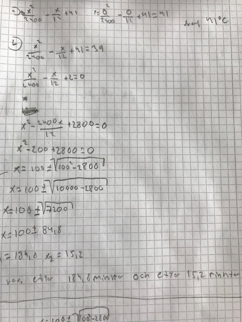 Jag är näst intill 100% säker på att svaren ska vara; efter 15.2 minuter och efter 184.8 minuter. Men i facit står det ”Efter 28 minuter och efter 172 minuter”. Jag hade både rätt på A och C uppgifterna samt att det har förekommit fel i detta facit:et tidigare. Är det jag som är fel ute eller rör det sig faktiskt om ett facit fel här?