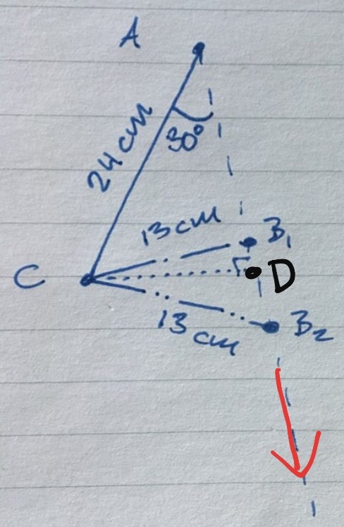 Se t.ex. fallet då sträckan BC är 13 cm. Då får du två möjliga placeringar av punkten B (figuren är inte skalenlig eller superbra ritad, så häng inte upp dig på den exakta längden av sträckorna i figuren). I ena fallet är vinkeln B spetsig och i det andra fallet är vinkeln B trubbig.