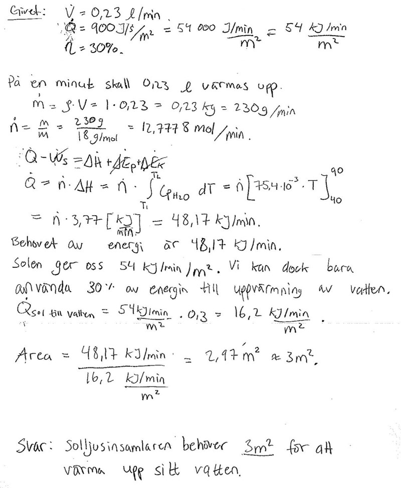 Antag att du funderar på att bygga ett hus vars varmvatten ska värmas upp med solenergi (en vanlig värmepanna finns installerad för molniga dagar). Du har beräknat att vattnet behöver flöda till uppvärmningsenheten med ett volymflöde på 0.23 dm3/min. Vattnet som ska värmas har en medeltemperatur på 40 ◦C. Du uppskattar att vattnet bör värmas till 90◦C innan det lämnar värmaren för att sedan gå till en ackumulatortank. Från ackumulatortanken kan vatten sedan pumpas till elementen och kranarna i huset. Genom samråd med en återförsäljare av solljusdrivna uppvärmare har du fått reda på att 30% av energin i det infallande solljuset kommer att kunna användas för uppvärmning av vattnet. Hur stor area kommer solljusinsamlaren behöva?