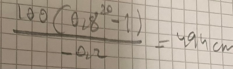Jag tänkte att det först är 1 meter som är startvärdet, och kvoten är 0,8. Sen så studsar bollen 20 gånger så exponenten enligt en geometrisk summa borde vara 20?