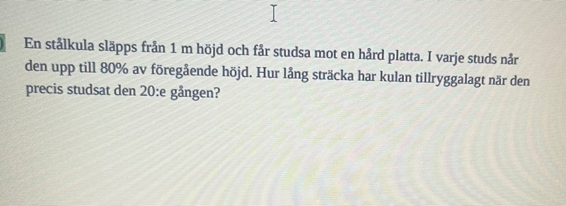 Jag tänkte att det först är 1 meter som är startvärdet, och kvoten är 0,8. Sen så studsar bollen 20 gånger så exponenten enligt en geometrisk summa borde vara 20?