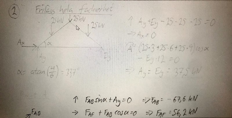 När de räknar momentet kring A, varför multiplicerar de det med cos(alfa)? När jag försökte lösa uppgiften gjorde jag likadant men utan att multiplicera med cos(alfa), då jag tänkte att jag flyttade krafterna längst med deras verkningslinjer. Vad är det jag missar?