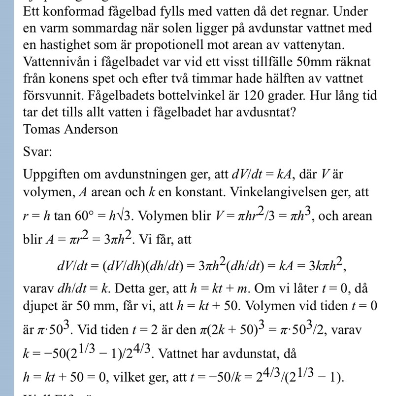 Jag har gjort likadant som Sidra, fram till kedjeregeln. dV/dt = (dV/dh)(dh/dt) Har också fått fram -kA = -3kπh^2. Men vad ska jag med den informationen till egentligen? När jag senare får ut att k=5,12 tack vara formeln "h=kt+m" och provar sätta in den i kedjeregelen så ser jag ju att det stämmer. Undrar mest hur jag härleder "h=kt+m" och förklaringen till varför den ska användas