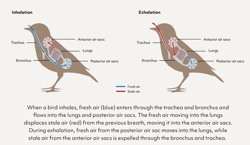 Fåglarna har sk. luftsäckar. Förenklar uttryckt så andas de, som vi, först in i lungan. Men sen förs luften vidare till en luftsäck iställer för att, som vi, andas ut. Luften passerar sen lungan en andra gång innan den andas ut. Med andra ord passerar luften lungan två gånger o därmed tillvaratas mer syre än om den bara passerade en gång.