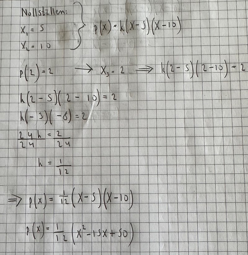För ett andragradspolynom p(x) gäller p(5) = p(10) = 0 och p(2) = 2. Vilket är polynomet?