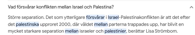 Alltså är faktorer bl.a. ett orättvist, diskriminerande system, separation, våld... kanske t.o.m. Gazakriget som rasar idag(?) Vad är ytterligare några faktorer som försvårar lösningen av denna konflikt som jag kan ta upp i mitt svar?