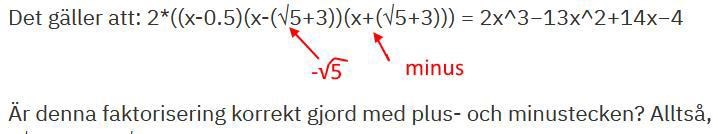 Är denna faktorisering korrekt gjord med plus- och minustecken? Alltså, 2*((x-0.5)(x-(√5+3))(x+(√5+3)))