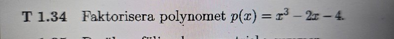 Här kan du antingen göra polynomdivision enligt liggande stolen för att hitta q(x), eller så kan du bestämma q(x) genom att först ansätta q(x) = ax2+bx+c och sedan bestämma a, b och c ur sambandet x3-2x-4 = (x-2)(ax2+bx+c).