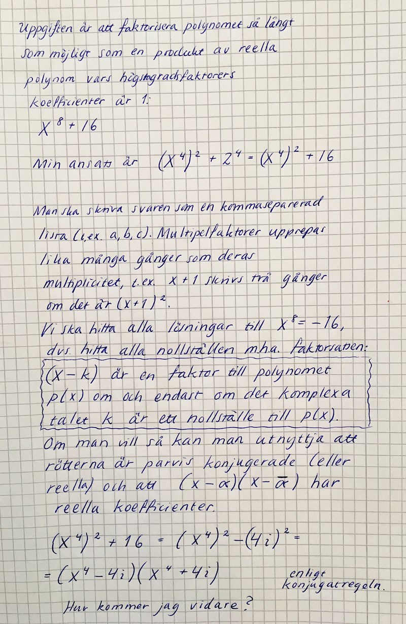 Jag kommer att visa mina lösningar i nästa inlägg jag gör och därefter multiplicera ihop de konjugerade paren för att få fyra reella faktorer.