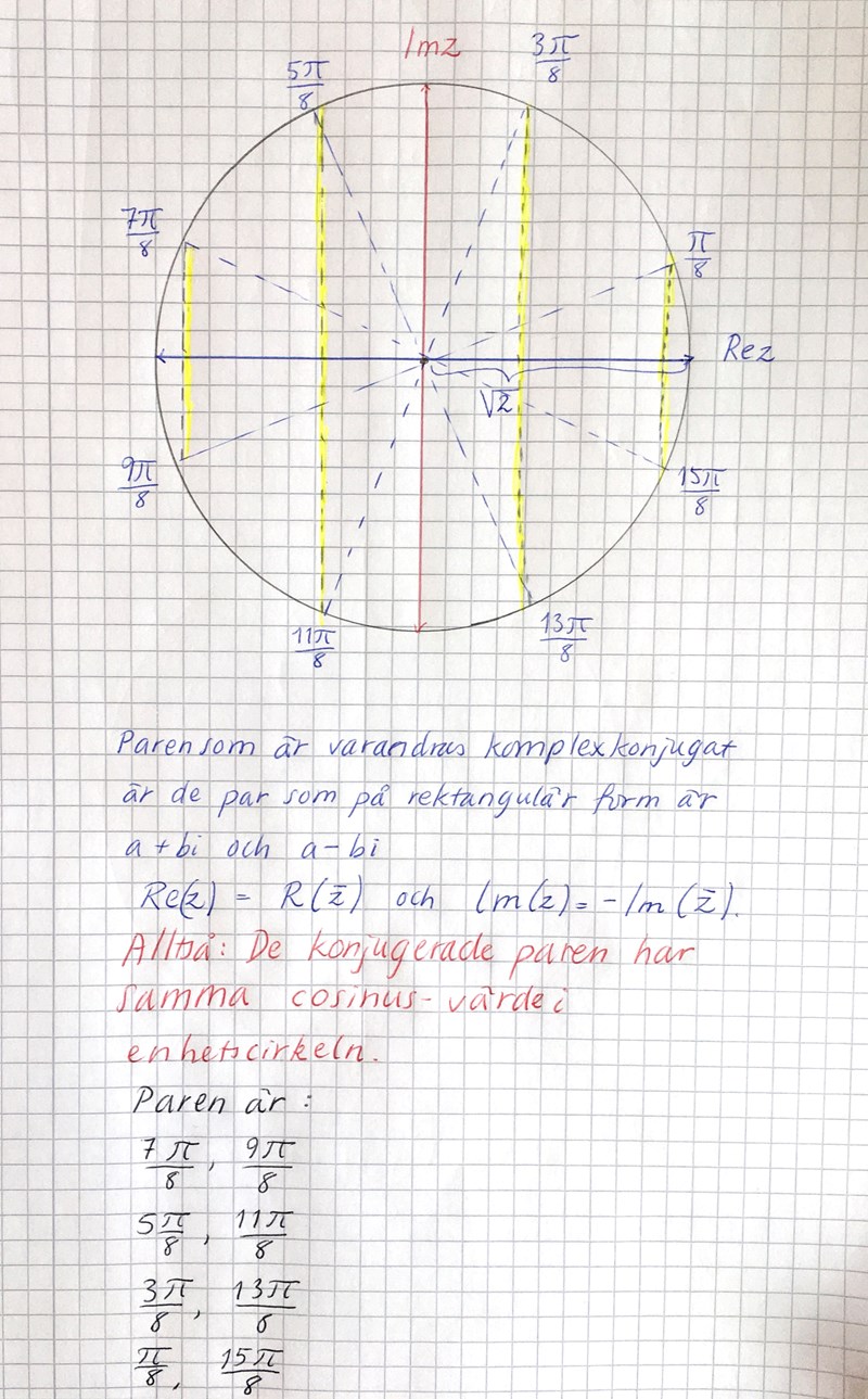 Nu kan jag se vilka par av rötter som är konjugerade och som hör ihop. De står mitt emot varandra i cirkeln.