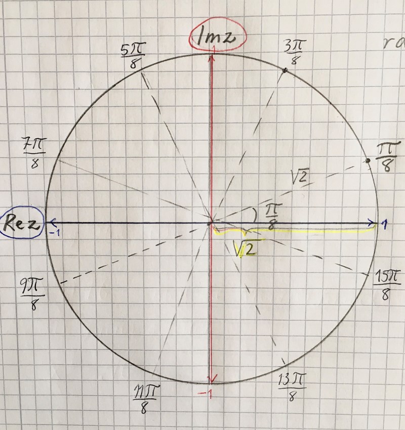 Absolutbeloppet är och när jag ritar upp de 8 lösningarna i det komplexa talplanet är därför radien
