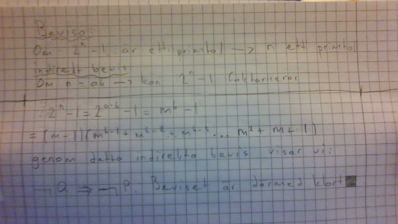 Cristian0311 skrev:Jag vill dela upp 2n-1 i faktorer för att visa att det inte är ett primtal. Hela uppgiften är lite annorlunda, det handlar om ett bevis där jag skrivit ett indirekt bevis, (falsk) Q ->(falsk) P. Jag har surfat runt på webben och hittat: