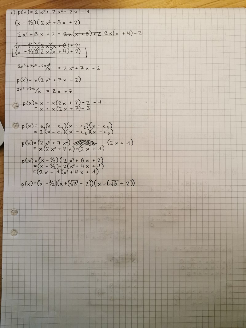 Hej, jag ska faktorisera ett tredjegradspolynom p(x) =2x^3+7x^2-2x-1. Det ska skrivas som en produkt av polynom av grad 1. Jag vet sedan tidigare att rötterna till polynomet är x=1/2, x=-sqrt3-2 och x=sqrt3-2. Jag bifogar en bild på det jag har gjort hittills. Jag har testat många olika metoder men kommer inte lägre än grad 2, försöker jag faktorisera mer blir det inkorrekt.