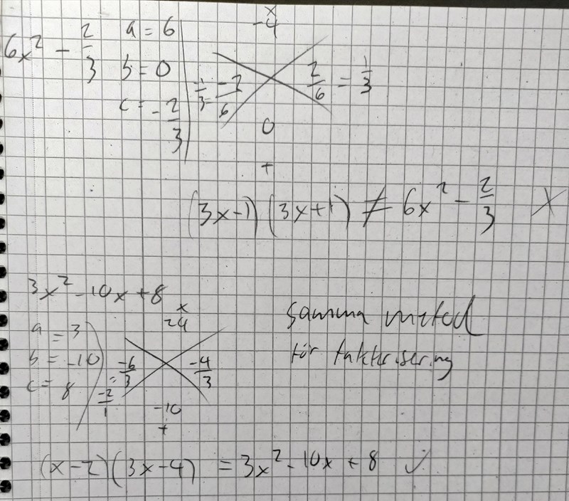 Jag applicerar samma metod för att faktorisera andragradsekvationer, den har funkat 99% gånger men nu plötsligt fungerar den inte. Det är 6x^2 - 2/3 som jag försöker faktorisera. Jag härleder 2 binom successivt, men när jag expanderar dessa binom motsvarar de ej min andragradsekvation. Jag har aldrig varit med om något liknande, så jag vet inte vad jag ska göra nu: huruvida jag ska använda min metod som jag har använt eller inte för framtiden. Det borde finnas ett sätt att checka innan man faktoriserar om en funktion äns kan faktoriseras, finns det en sådan metod? Det hade hjälpt ganska mycket! Med mitt exempel visar jag även hur samma metod misslyckas i det ena fallet men lyckas i det andra.