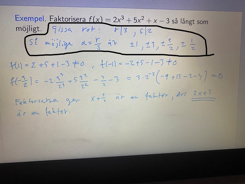 Hoppas att någon kan hjälpa mig genom att förklara vad menas det med r/3 och s/2? Och hur hittar man de möjliga rötter som är - eller + (1; 3 ; 3/2 ; 1/2) som står tydligare på bilden? Och räcker det att man hittar bara en rot för att dividera sen ?
