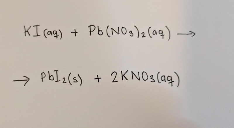 2Kl + Pb(NO3)2 --> PbI2 (s) + 2KNO3 (aq)