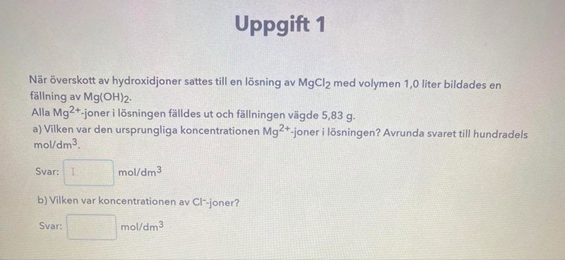 Hur gör man på följande uppgift. Tänkte att man skulle ta M=m/n för att ta reda på antal mol och sedan dela det med volymen 1 dm^3 men får fel koncentration. Tacksam för hjälp!