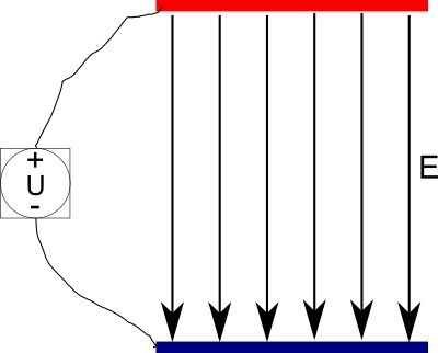 T.ex om spänningskällan är på 10V så har den röda plattan 10V högre potential än den blå.