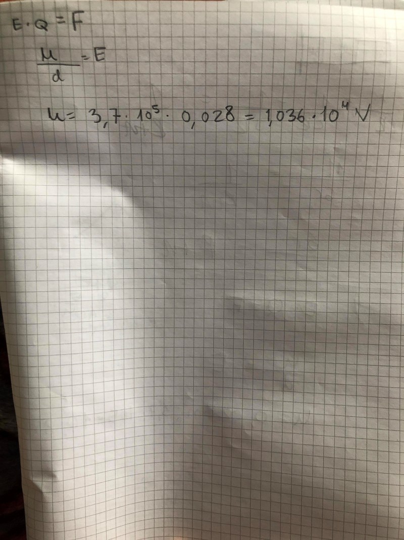 Fältstyrkan mellan två parallella plattor är 3,7•105 N/C. Hur stor är spänningen mellan plattorna om avståndet mellan dessa är 2,8 cm?"