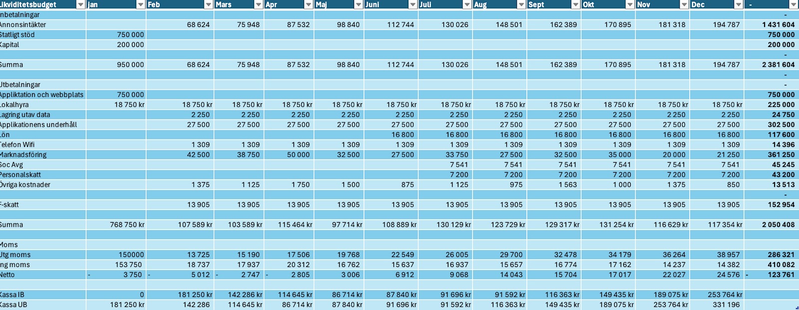 Anledning till att jag satt 750 kkr som inbetalning i likviditetsbudget är att jag antar att man får statliga stödet med momsen (150 kkr) eller ska jag ligga ute med den själv.