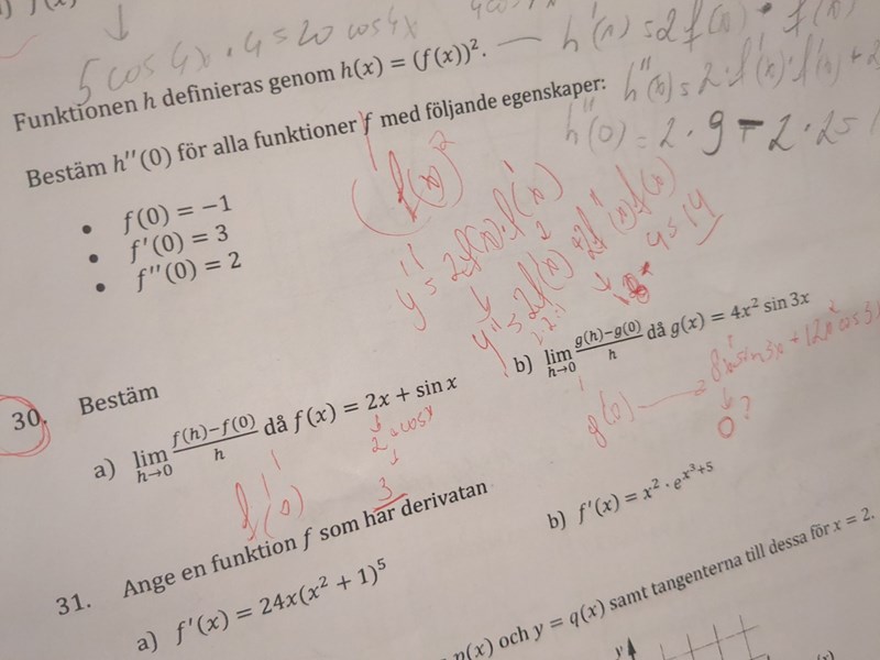 Jag skrev att den uttryck är lika mycket med den första derivatan g'(0). Sen får jag svaret 0, men i facit står det 3 . Vad gjorde jag för fel?
