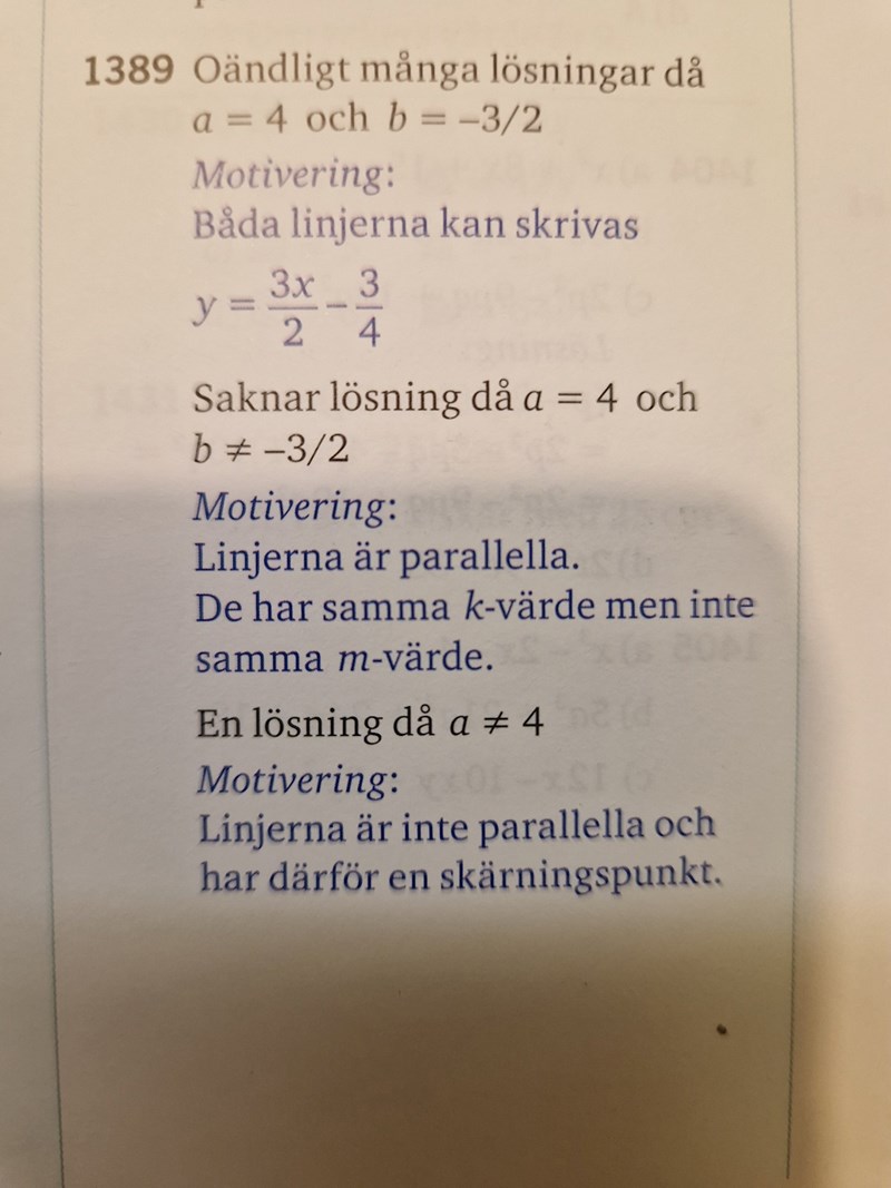 Jag löste ut y ur 2y-b =3x och fick Y=1,5x+0,5b. Sedan tänkte jag för att 0,5b = -3 alltså ha samma m-värde bör b=-6