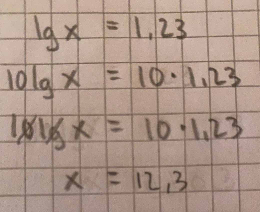 För att få bort Lg i V.L så x:et står självt där så behöver jag ta 10 i V.L. & i H.L (vet dock att motsatsen till Lg är 10^ till något, så kanske ska jag skriva typ 10 ^1 i V.L istället för bara 10?)