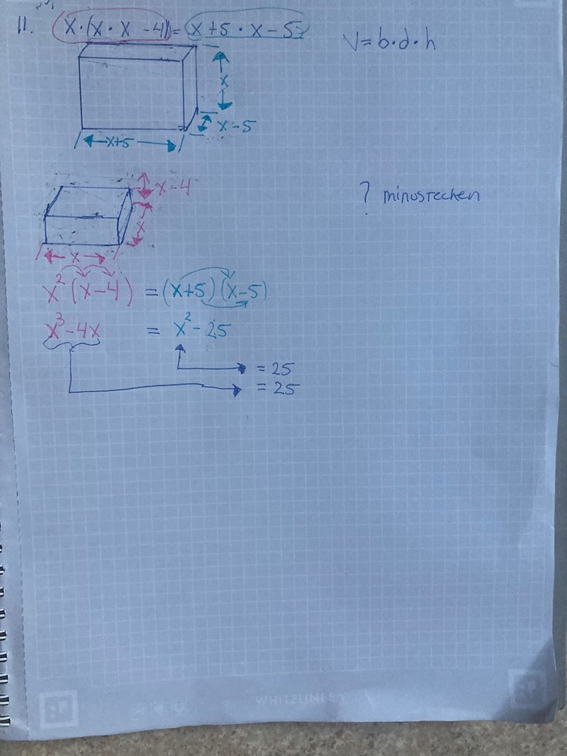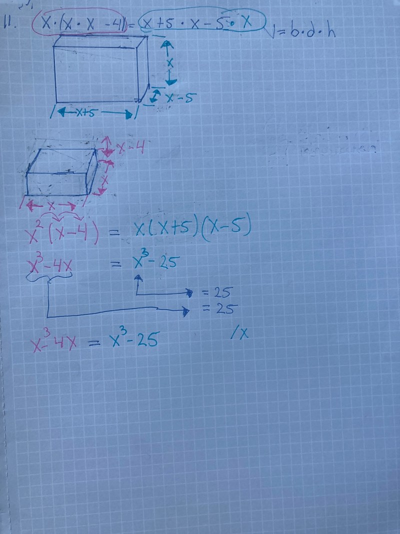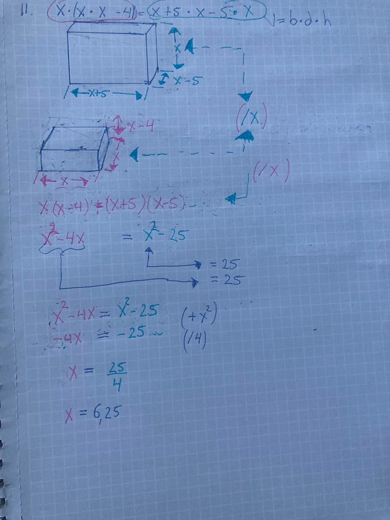 x(x-4) = (x+5)(x-5)Geometriskt kan du se att eftersom båda rätblocken har en kant x är det bara två sidoytor som du behöver sätta lika. Vilket är vad ekvationen ovan återger.