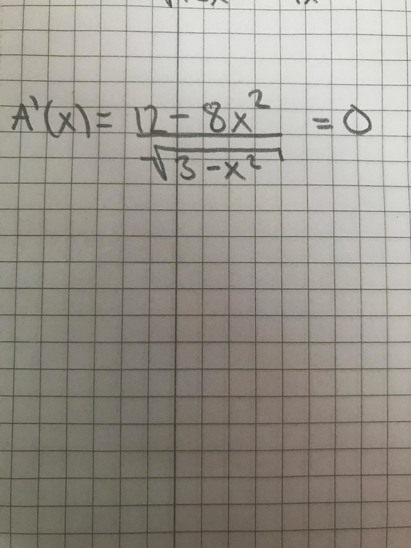 Enda möjligheten för A'(x) att bli 0 är om nämnaren är 0, så . Lös den ekvationen, och kolla sedan att det x-värdet inte gör att nämnaren blir 0 (i så fall saknas lösning).