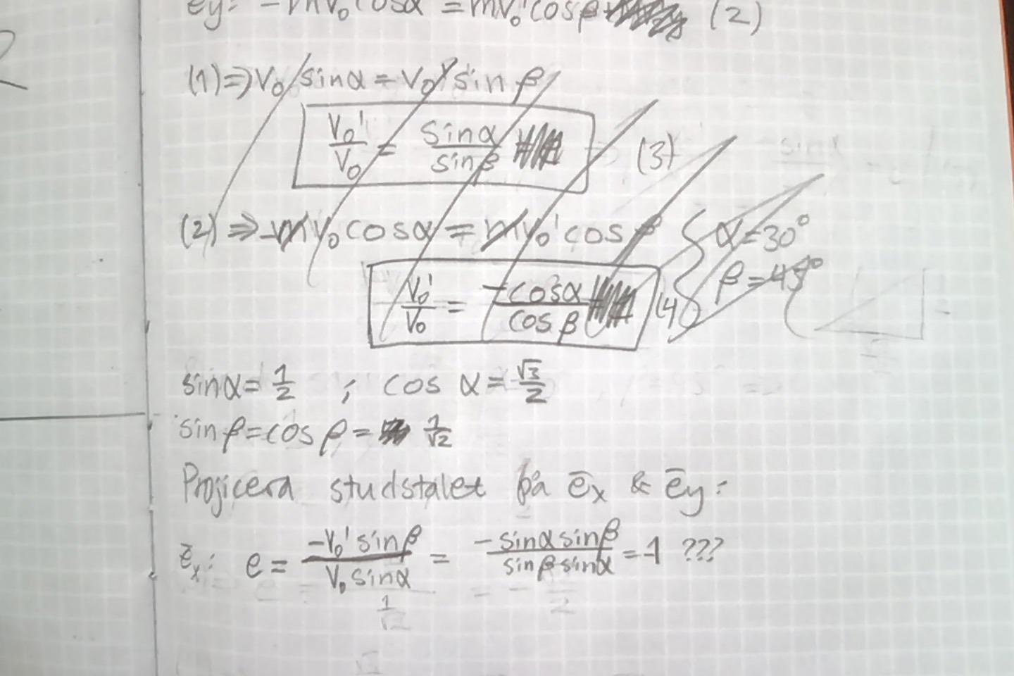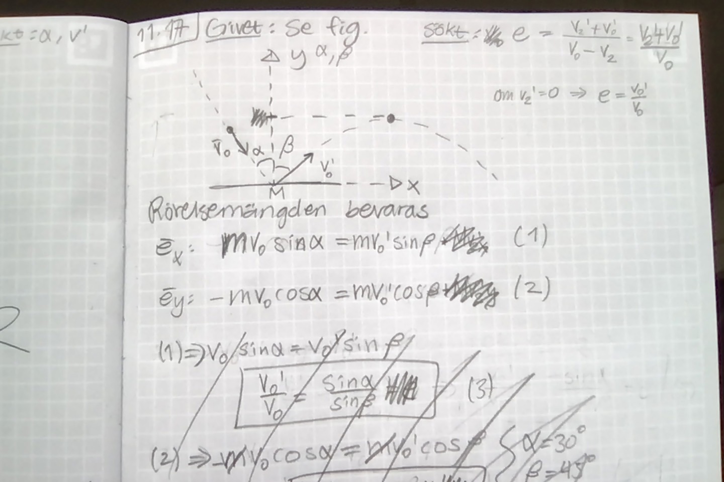 Jag får olika värden på studstalet beroende på om jag använder ekvation (3) eller (4) (överstruket för att jag tror att något där är fel, men hoppas att det går att läsa ändå). Det borde det väl inte bli? Varför blir det så?