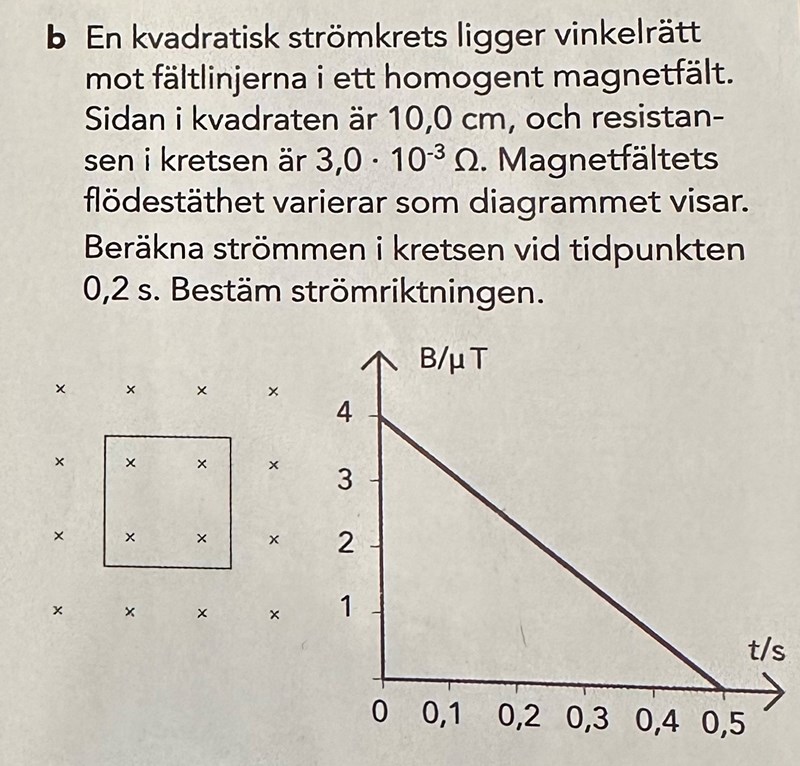 Tänkte att man kunde hitta variationen av det magnetiska flödet med hjälp av den räta linjen som visar hur den magnetiska flödestätheten varierar över tiden. Denna variation satte jag sedan in i formeln för induktionslagen med t=0.2, men det blir fel.