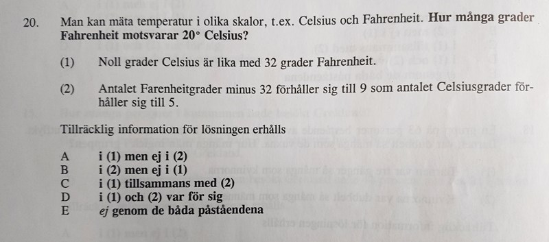 Du kan inte svara på frågan med enbart (a) eftersom du inte vet sambandet mellan Fahrenheit och Celsius. 1 gr F är inte samma sak som 1 gr C, så 20 gr C motsvarar inte 53 gr F bara för att 0 gr C motsvarar 32 gr F.