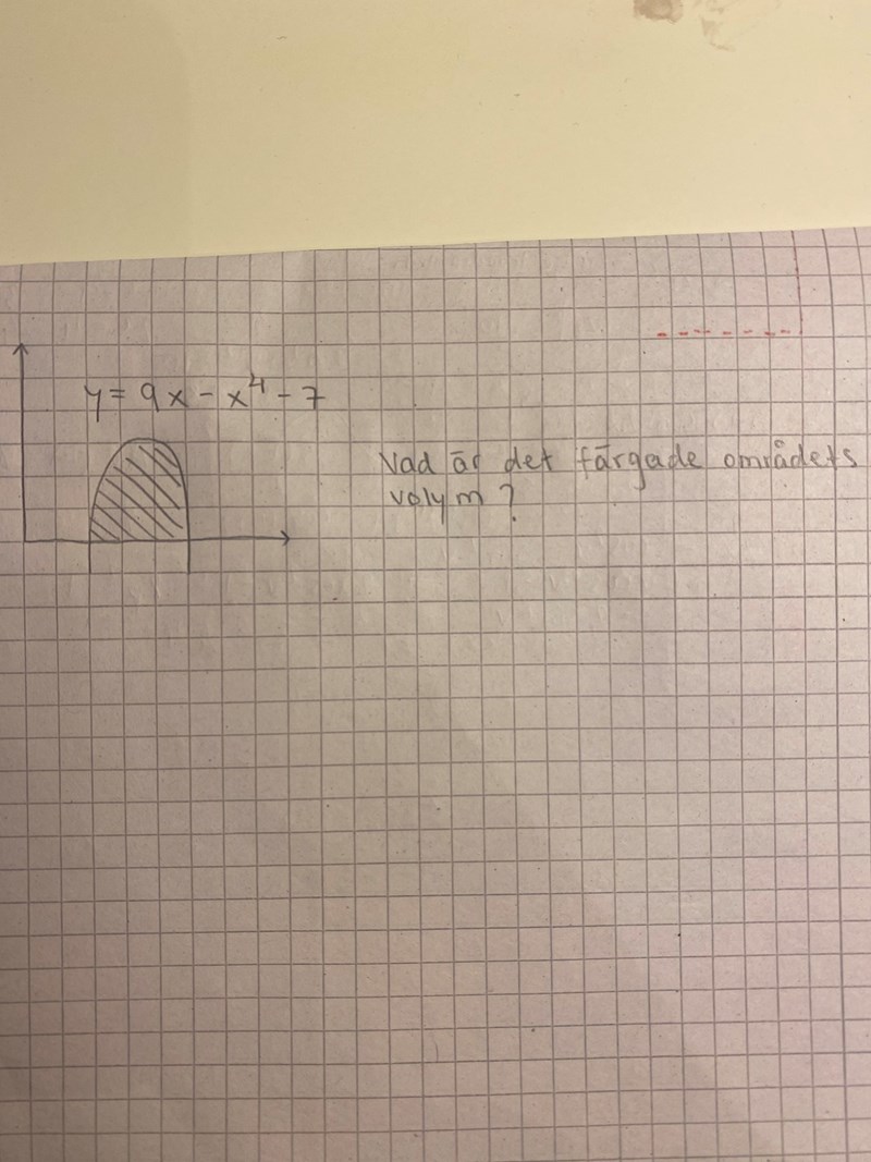 Hej! Behöver hjälp med denna fråga, vet att jag kan beräkna volymen med hjälp av en integral, dock vet jag inte hur jag ska få fram integralgränserna. Vet också att y=0 för att få fram x (nollställena).