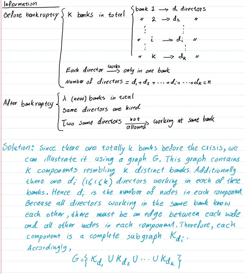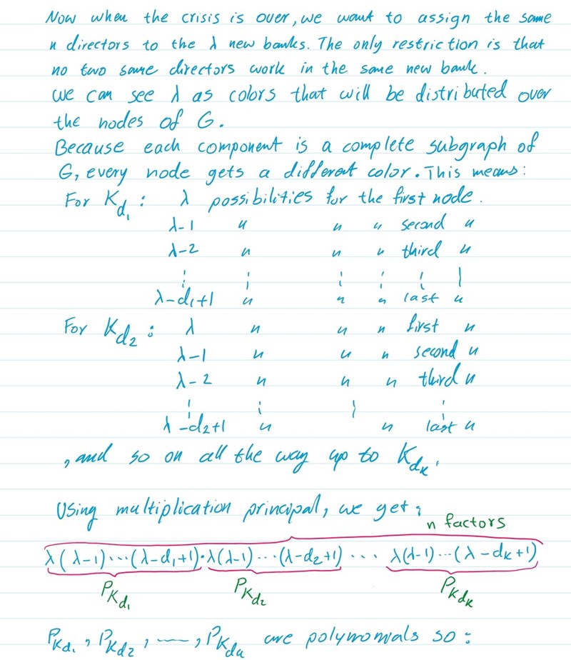 Minns ni den stora bankkrisen i början av 90-talet? Totalt fanns det k banker före krisen. Bank 1 hade direktörer, bank 2 hade d2 direktörer och så vidare. Totalt finns n direktörer. Varje direktör arbetar bara i en bank, så d1 + d2 +... + dk = n. När alla banker gått bankrutt beslutar regeringen att skapa ett nytt banksystem med nya banker. Samma direktörer anställs igen, men så att två direktörer som tidigare var på samma bank inte får hamna på samma nya bank. Visa att antalet sätt att för fixt n fördela direktörerna på de λ nya bankerna (utan restriktioner på hur många som hamnar på varje bank) är ett polynom λn + an-1 λn-1 + ... + a0, och att