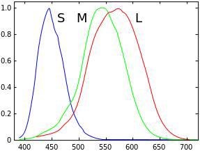 Om vi istället fokuserar på biologin så finns som sagt i ögat tre typer av ' färgförnimmande' sinnesceller, koner, som reagerar olika på olika våglängder av ljus. Dessa tre kontyper, S/M/L (small/medium/long dvs kort/medel/lång) som reagerar olika starkt på olika våglängder i grova drag enligt denna graf.