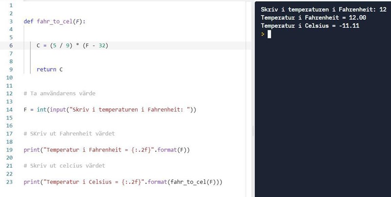 Jag ska göra om fahrenheit till celcius i heltal. Problemet är dock att jag endast får till decimaltal och jag kan inte se vart det är jag gör fel någonstans, jag är helt grön inom programmering. Jag testade med (//) men då blev svaret alltid 00.00 när den skulle konvertera om till celcius.