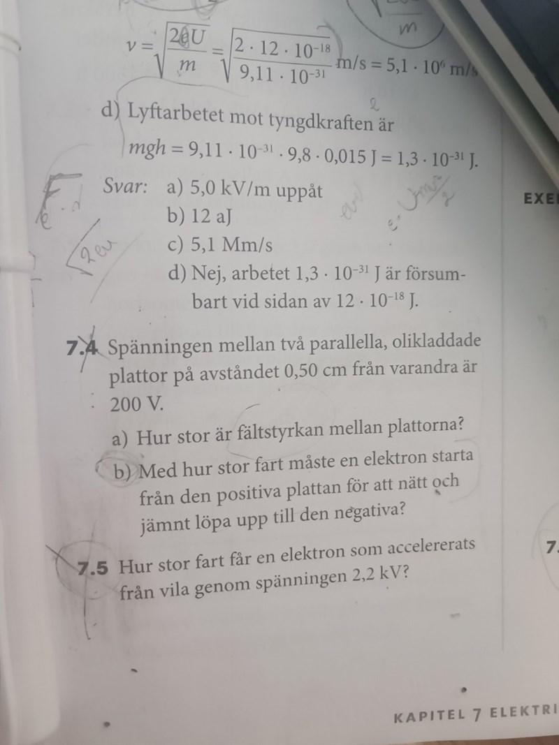 Jag undrar hur jag ska göra på 7;4 b) , jag har kommit fram att jag kan använda mig av formeln MV^2/2=Q*E*d