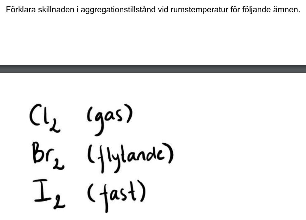 Hej! Jag fick denna fråga av min lärare och har grubblat ett tag men kommer inte fram till något. Någon snäll som skulle kunna förklara varför molekyler med rent kovalenta bindningar kan ha olika Aggregationstillstånd i samma temperatur