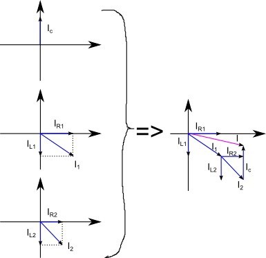 Alla tre komponenterna (de två spolarna och kondensatorn) är parallellkopplade, det innebär att totala strömmen är summan av de tre strömmarna.