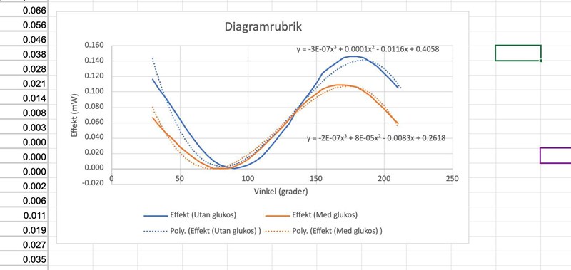 Vi har haft en laboration där vi skulle undersöka hur stor del av intensiteten från linjärt polariserat laserljus som transmitteras genom en polarisator som vrids i olika vinklar. Ena kurvan representerar ljus som går igenom luft och den andra ljus som går igenom en behållare med glukoslösning. Vi ska på något sätt beräkna fasskillnaden mellan dessa kurvor men vet inte riktigt hur vi ska komma igång med det.