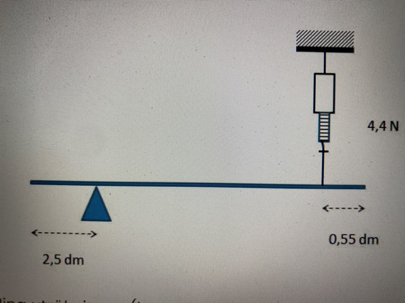 En 9,2 decimeter lång och jämntjock stång vilar på ett stöd. 0,55 dm från ena änden hängs en dynamometer så att stången ska hänga vågrätt. Då visar dynamometern 4,4 N. Hur mycket väger stången?