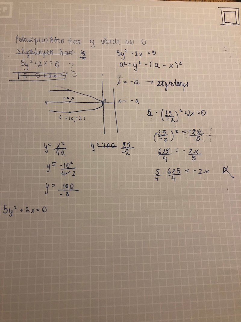 Bestäm koordinaterna för fokus och styrningens ekvation för parabeln 5ykvadrat+2X=0