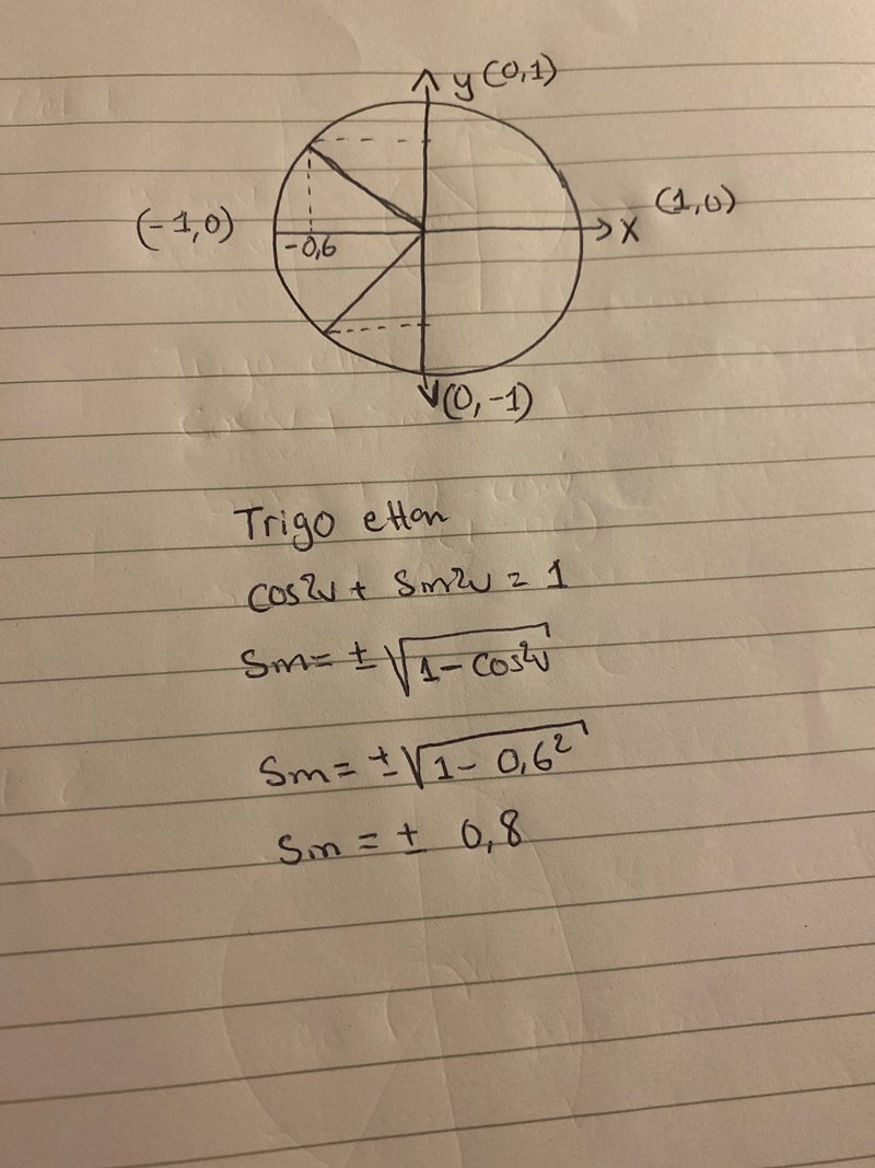 Rita upp enhetscirkeln och förklara hur cos v = - 0,6 kan ge två olika värden på sin v.