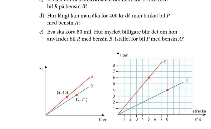 Bil R = 4/8 = 0.5 liter/sträcka Bil P = 6/5 = 1.1 liter/sträcka