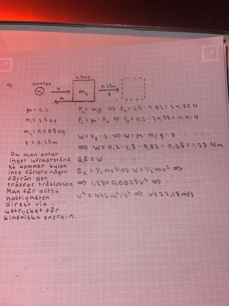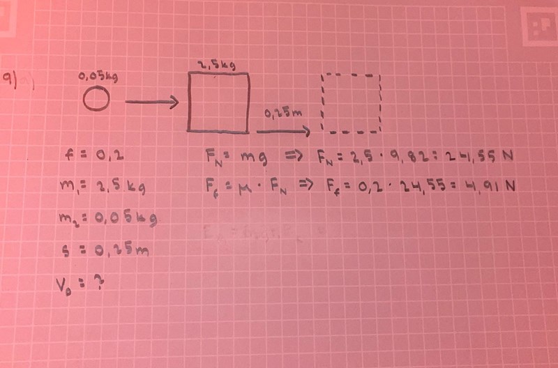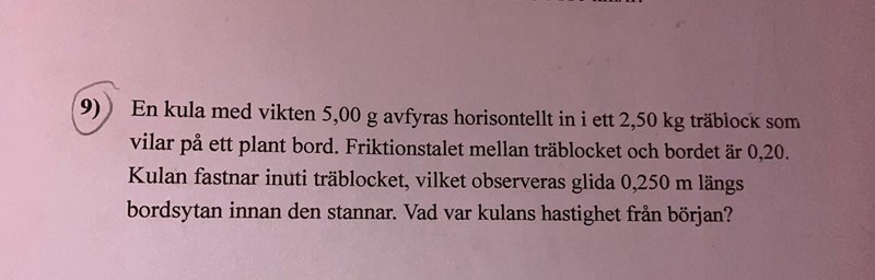 Fick tips om att kulan kommer ha en viss kinetisk energi och friktionskraften kommer utföra ett visst arbete när träblocket flyttar sig.