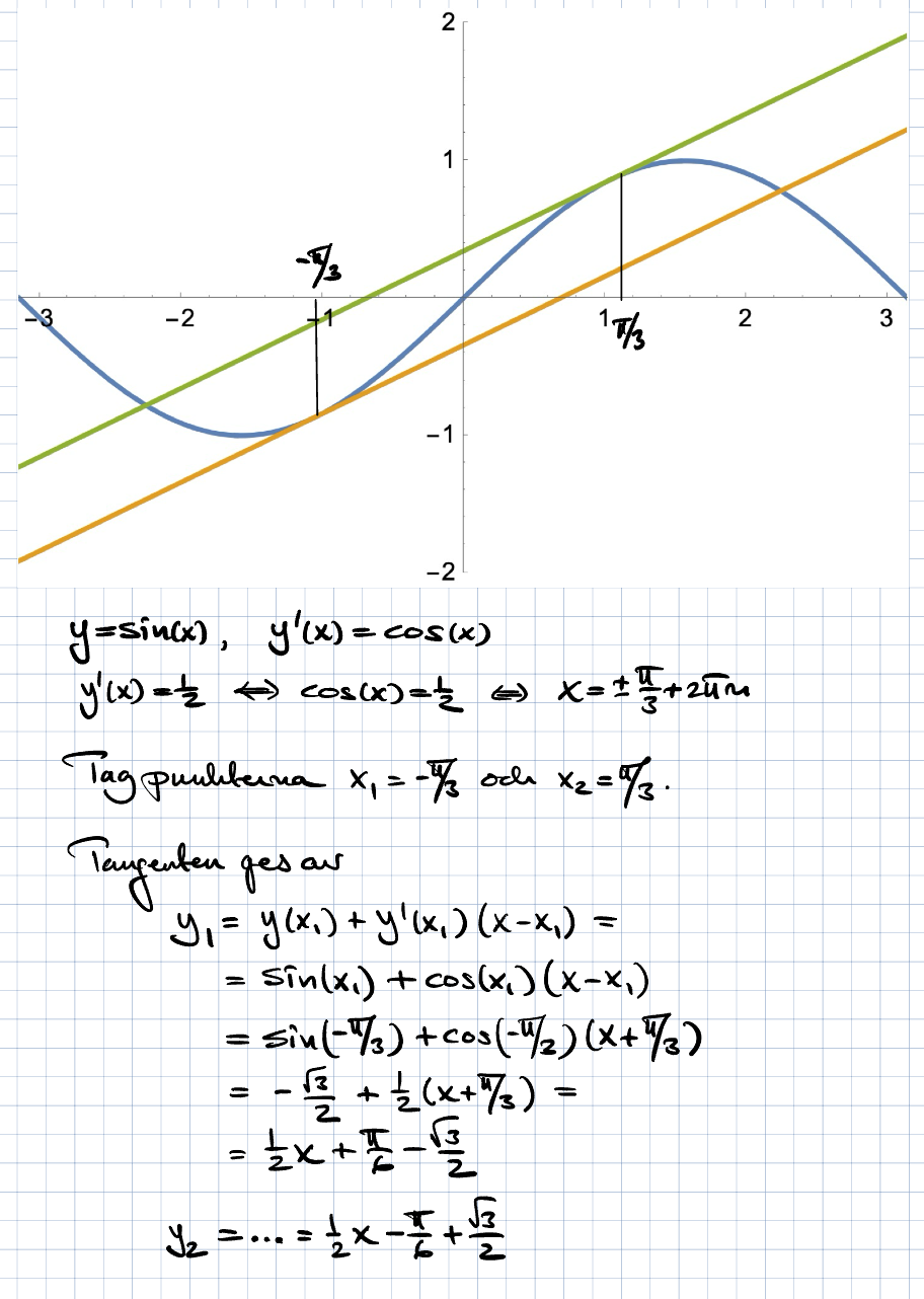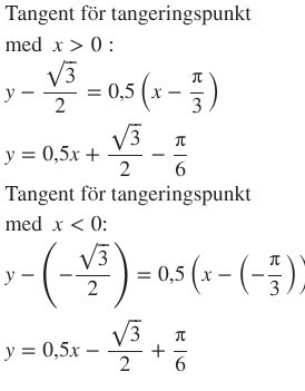 Hej! Jag har fastnat halvvägs genom lösningen till denna uppgift: Bestäm exakt ekvationen för två tangenter till y = sin x som har lutningen 0,5.