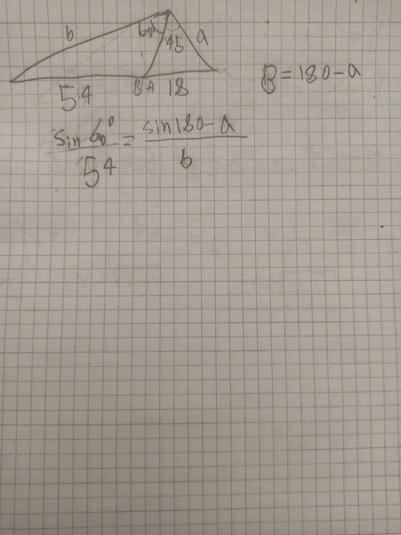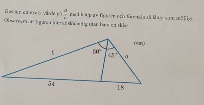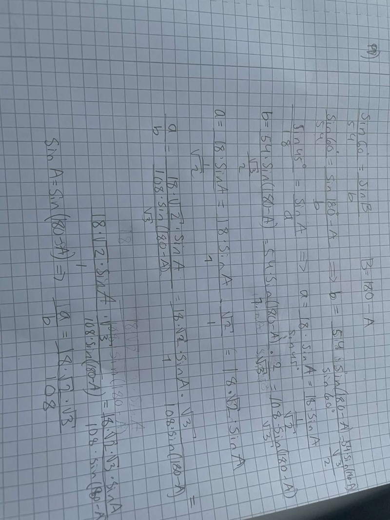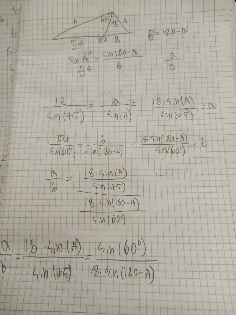 Du är nästan framme a/b=sin A/sin(180-A)*(18*sin60)/(54*sin45). Vad är sin(180-A)?