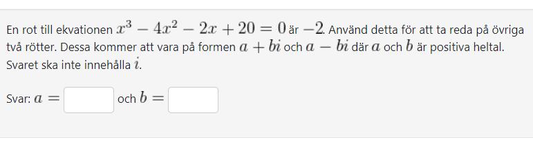 Dividera x3-4x2-2x+20 = 0 med x+2. Då får du fram en andragradsekvation. Denna saknar reella lösingar, men har två kompexa lösningar. Ange dessa.